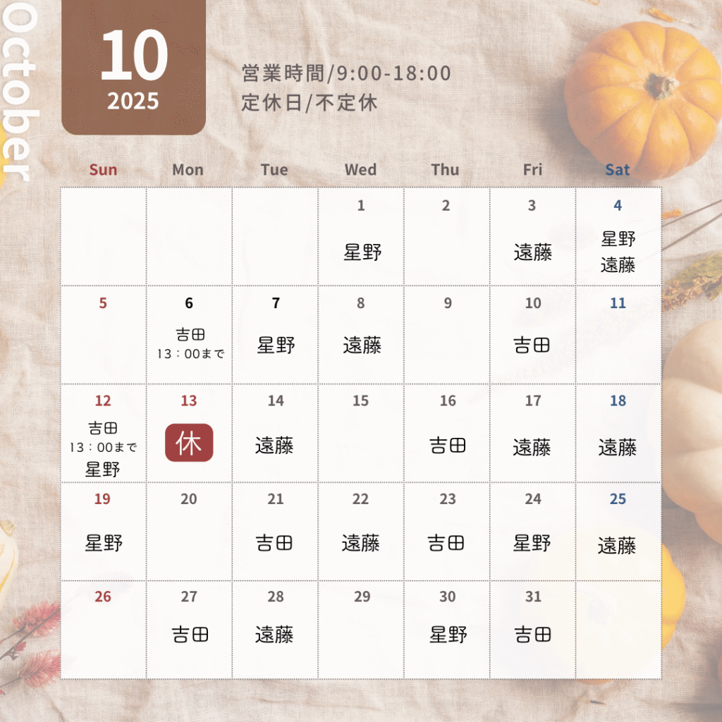 10月のスタッフの休み&定休日をアップしました!📅