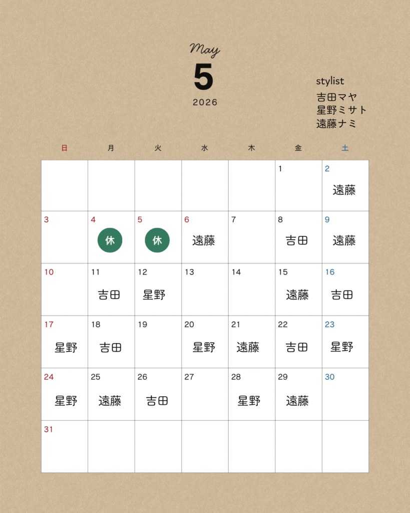 2026.04.15お知らせ 5月のお休み いつもご来店ありがとうございます😊 5月の定休日とスタッフのお休みをお知らせいたします。 ご希望のスタッフがいる場合は、ご来店の参考にしてくださいね✨ 5月も皆様のご来店を心よりお待ちしております🎏 お知らせ一覧に戻る